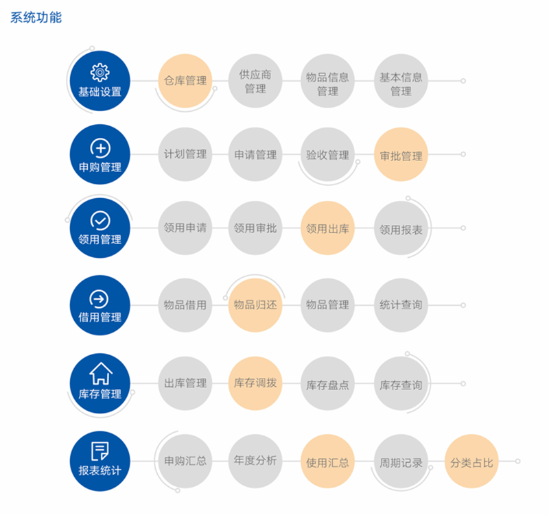 ①全程监管:申购→入库→申领→出库→退库→废弃全过程管理。