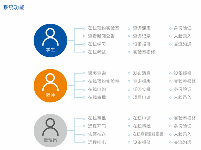 将整个实验室信息化移动端平台融入学校移动终端平台中,实现统一入口,一次登录即可用整个实验室信息化管理平台中各子系统。对接第三方系统,数据共用共享。智能管控实验室电源,有人使用即时通电,实验结束自动断电,保障实验室用电安全。智能硬件管控实验室门禁,有权限、有预约人员可自行出入,无权限人员禁止进入,保障实验室设备安全。