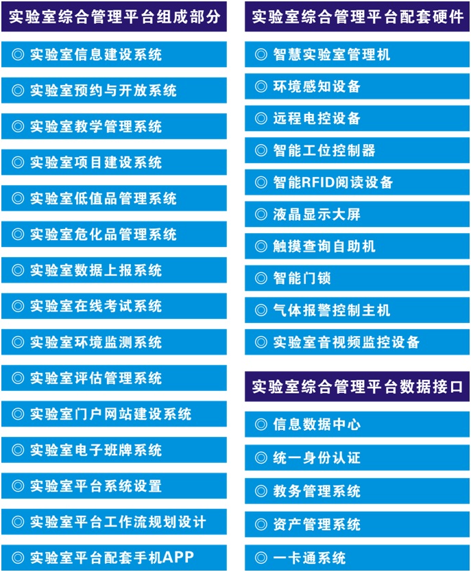 智慧实验室管理平台是基于java技术架构的一款纯B/S(IE浏览器访问)结构的解决方案系统,实现教务管理人员、设备管理人员、实验教学中心主任、实验室管理员、老师、学生互 动的网络化开放管理平台。整个系统平台整合了实验室与实践教学及其相关工作的业务流程,其内容涵盖了实验室建设、实验人员、实验用房、实践教学、开放实验、实验室开放、实验预约、实验课表、实验考勤、实验成绩、实验门禁、视频监控、设备耗材、大型仪器、数据上报、实验办公、实验资源、安全准入等元素,是一套信息高度共享、使用方便、功能强大、使用稳定的管理信息系统软件,可极大的提高实验室管理水平和实践教学质量。